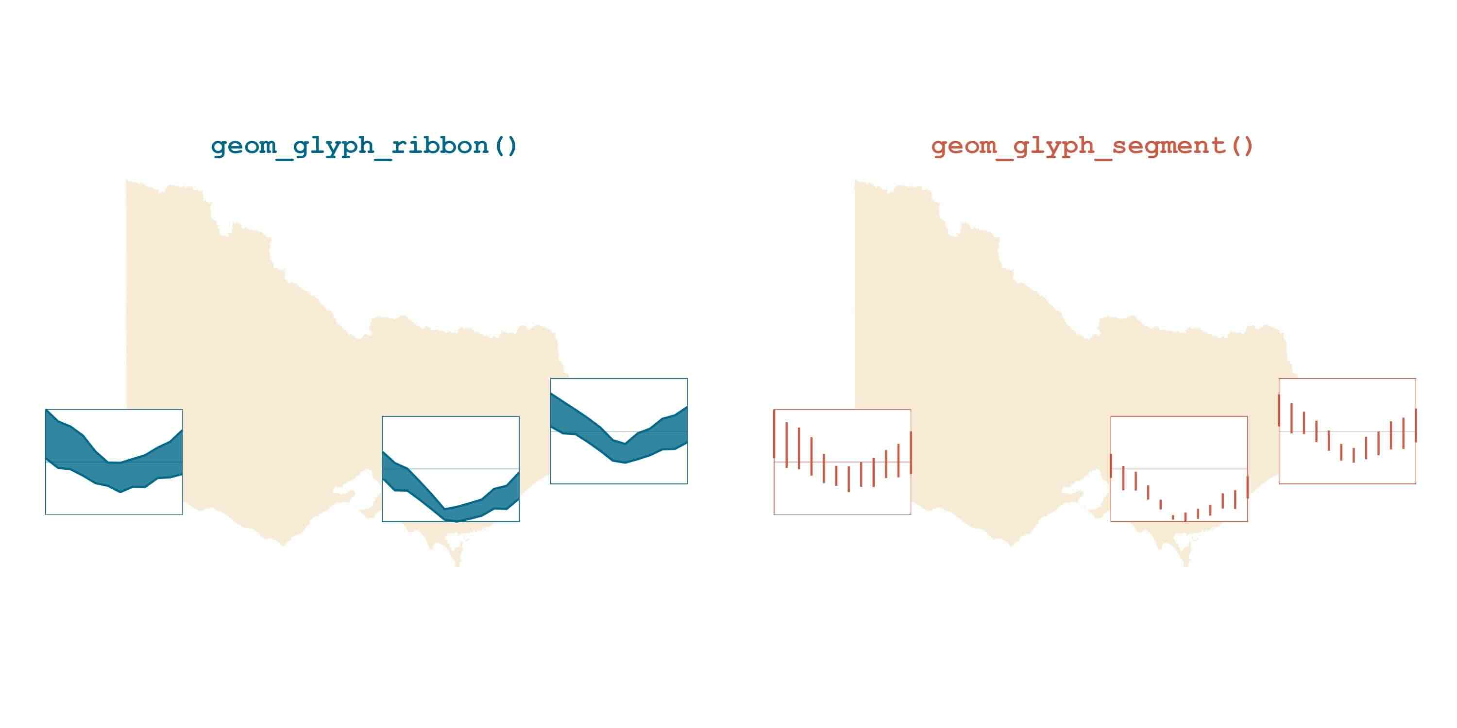 sugarglider provides ggplot2 extensions to create glyph maps that visualize seasonal aspects of spatio-temporal data with geom_glyph_ribbon() and geom_glyph_segment().